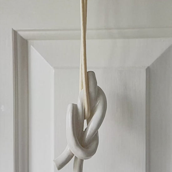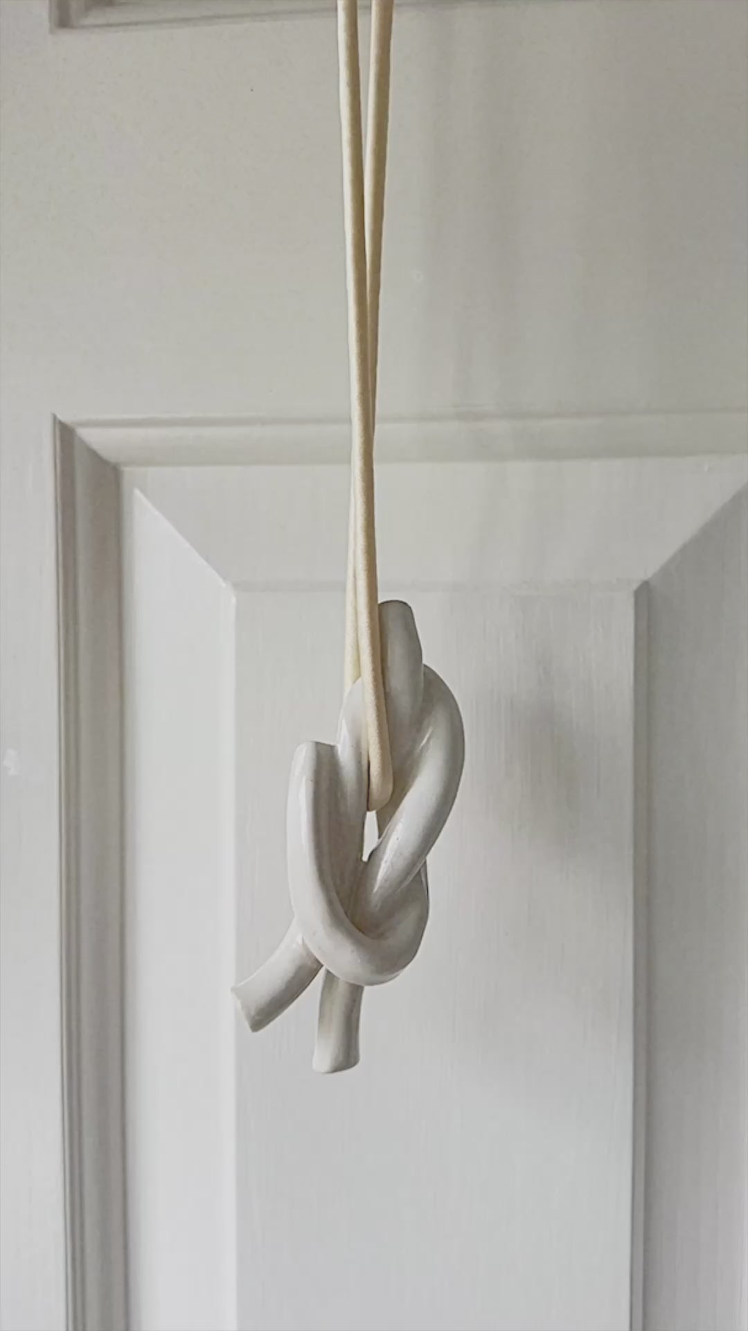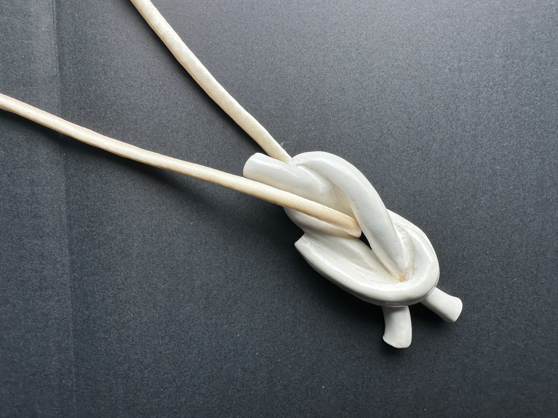 This ceramic knot pendant is hand-sculpted using a clay blend of bmix with grog, giving each piece its own one-of-a-kind appearance. The surface is dipped with majolica glaze, adding an off white color and glossy finish. Completed with a 1/4" ivory silk cord, adjustable in length via a sliding knot. Made by Gushi Studio.