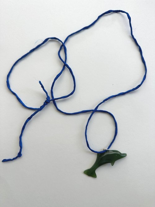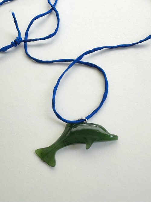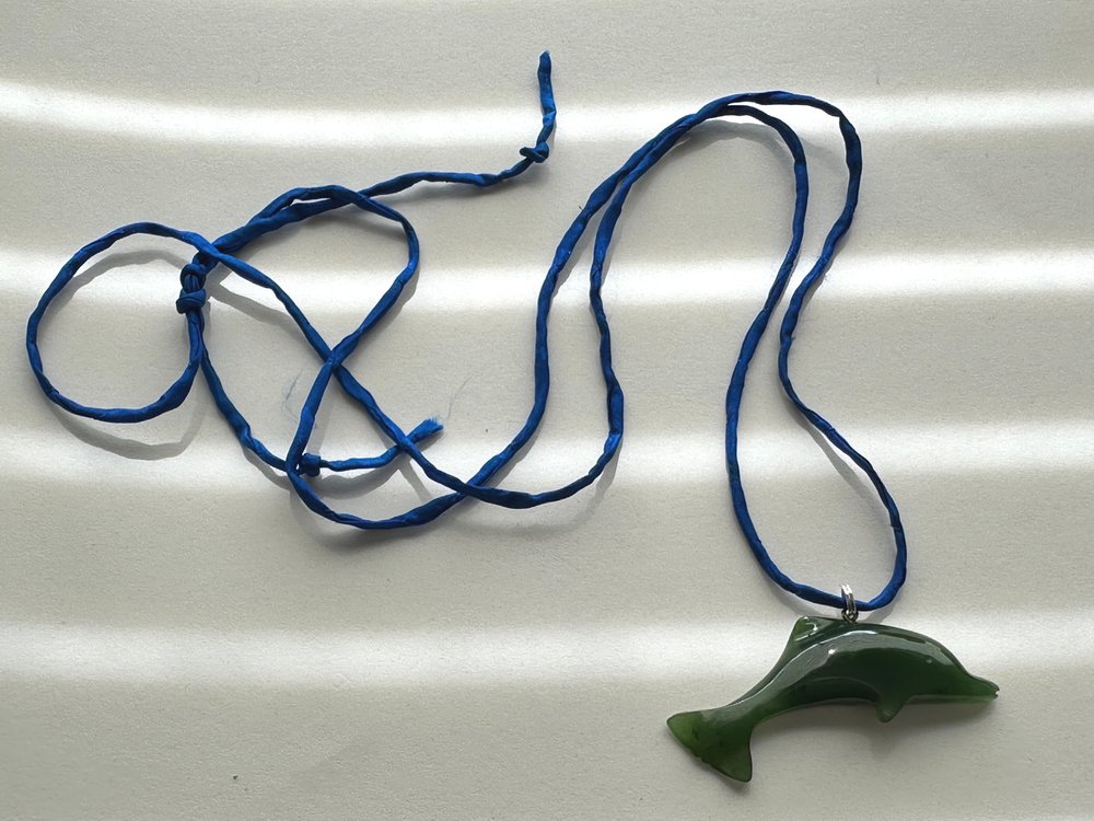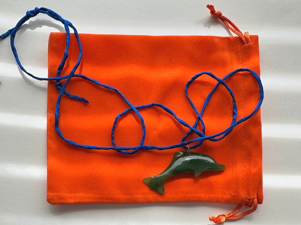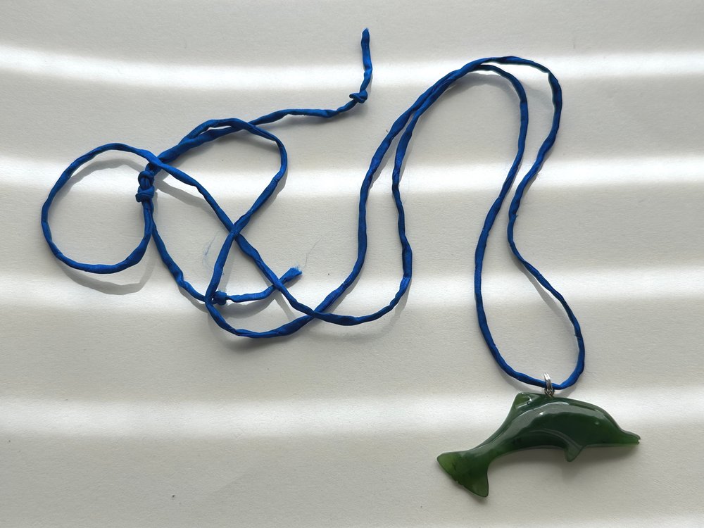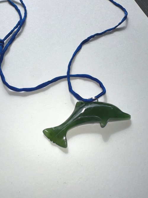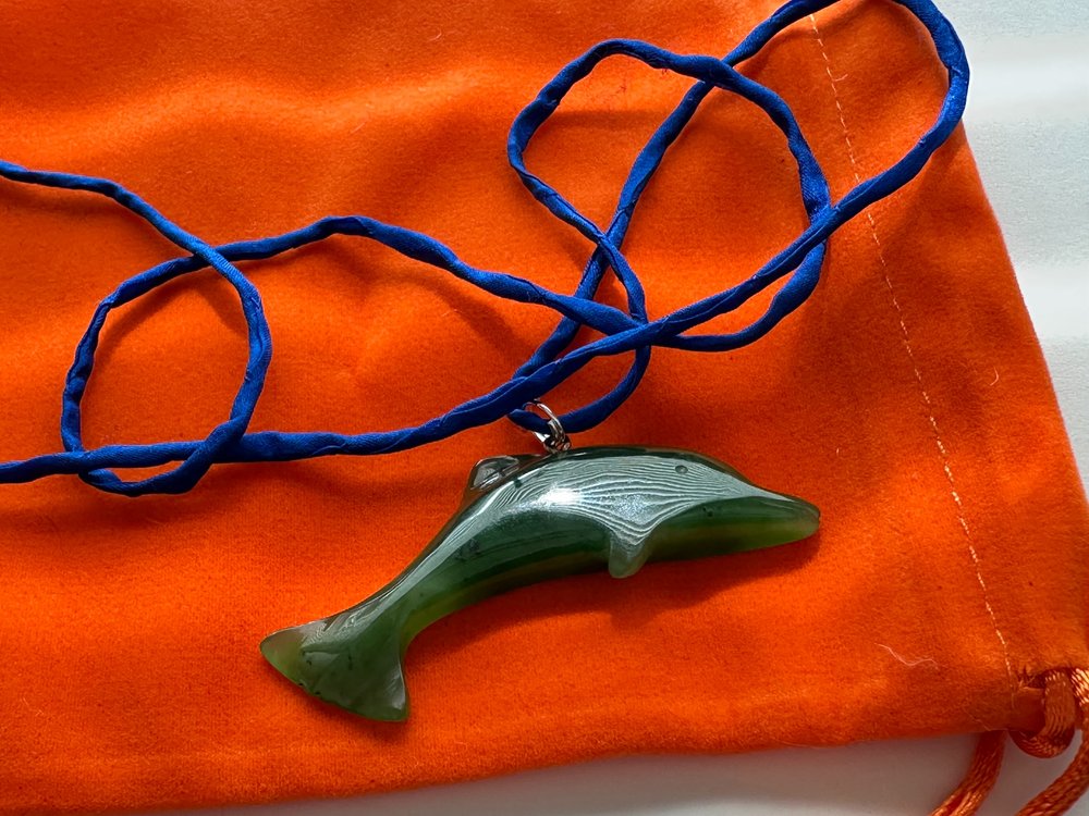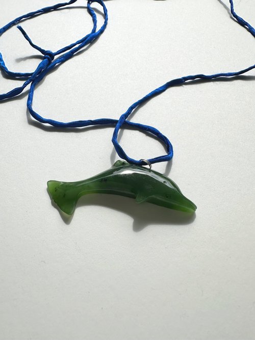Vintage Carved Nephrite Jade Dolphin Pendant Necklace.
