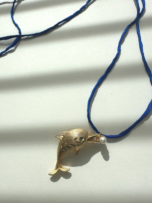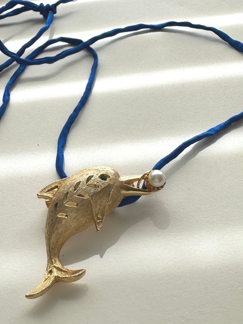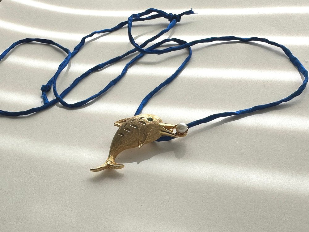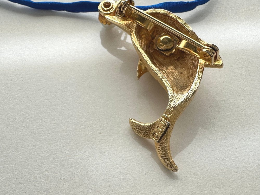 Vintage gold tone dolphin brooch pin (signed JJ) with faux pearl and green eye rhinestone. Gold plated jump ring added to allow brooch to be worn as a pendant.