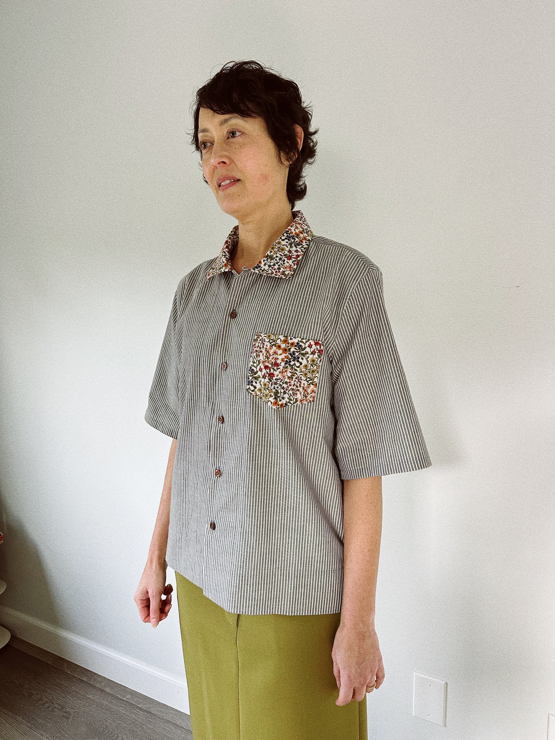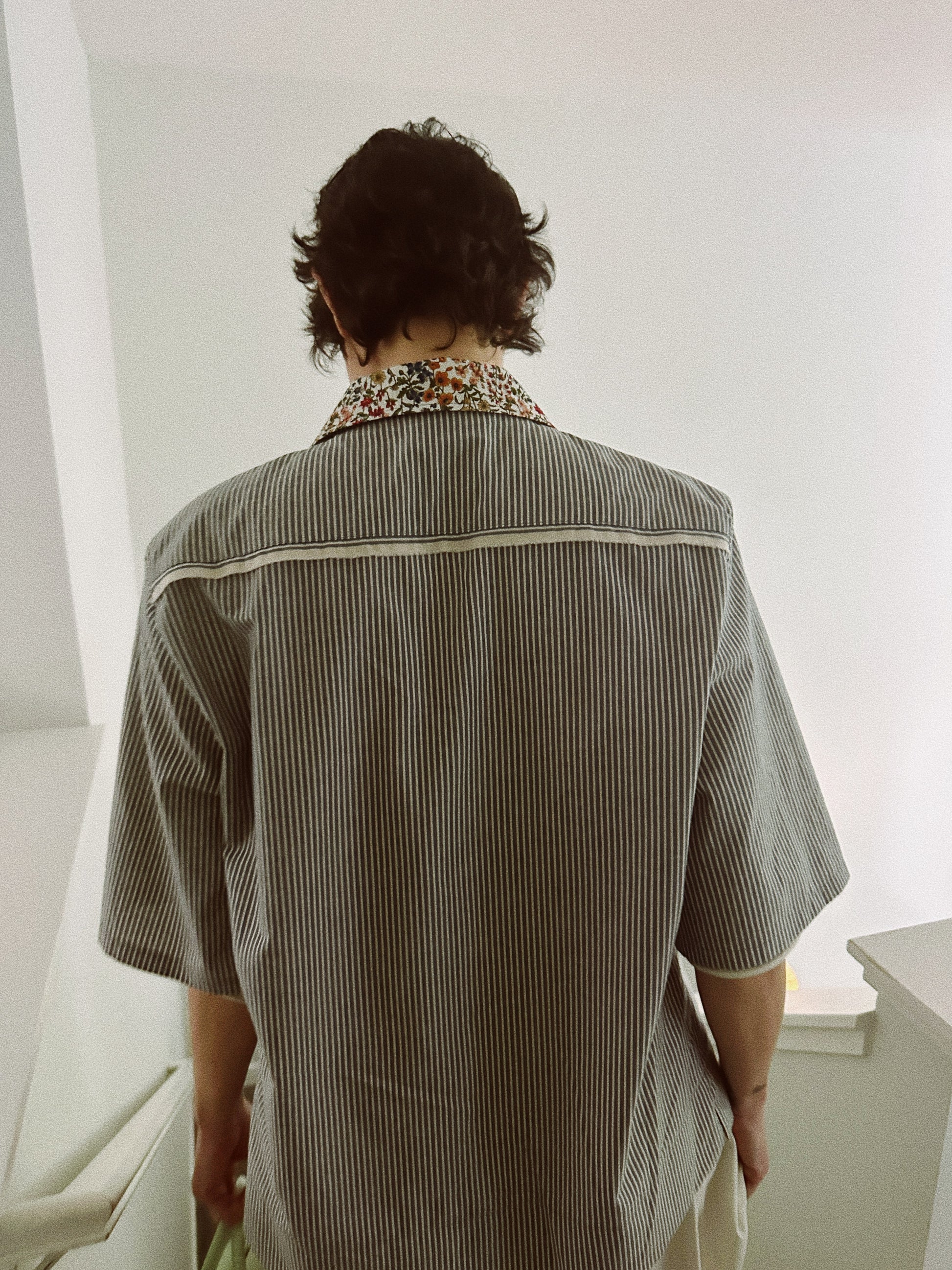 Designed with a classic, boxy silhouette and traditional button-up styling, this piece nods to heritage shirting while embracing a fresh, buoyant spirit. A crisp striped base sets the foundation, while unexpected floral accents at the pocket and collar add a vibrant contrast—striking the perfect balance between structure and whimsy. A strip of selvedge detailing lines the underside of the back yoke, offering a subtle surprise that ensures the view is just as compelling from behind as it is from the front.
